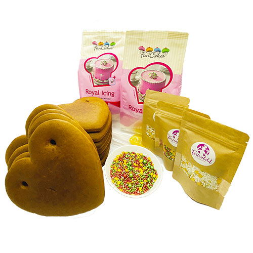Gestalten Sie Ihre Lebkuchenherzen individuell und selbst von Zuhause aus! Mit diesem DIY-Lebkuchenset erhalten Sie zehn fertig gebackene Lebkuchenherz-Rohlinge in ca. 17x14cm (Größe Midi im Shop), 2x 900g Icing Mischung, 10 Einwegspritzbeutel, 10 Bänder und vier 50 g Päckchen unseres Weihnachtsstreudekosets. Mit diesem Set können Sie die Lebkuchenherzen nach Ihren Wünschen und Vorstellungen schmücken.